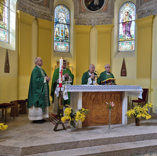 Nakon okrepe u župnoj kući krenuli smo u crkvu na svečano zahvalno euharistijsko slavlje kojim je predsjedao mons. Ratko Perić, umirovljeni mostarsko-duvanjski biskup i administrator trebinjsko-mrkanjske biskupije. Uz to je i sam nekoliko godina bio župnik u Trebinju. Uz župnika su koncelebrirala još dva bivša trebinjska župnika iz vremena djelovanja sestara u Trebinju, don Krešimir Pandžić i don Nedjeljko Krešić. Posebno mjesto u ovom slavlju imalo je 11 sestara koje su stigle iz Splita, Mostara, Ljubuškog i Tomislavgrada. Uz malobrojne domaće vjernike, skupio se i lijep broj onih koji su na neki način vezani za sestre koje su djelovale u bolnici u Trebinju. Glazbeni je dio pripremila djevojačka grupa „Angelus“ iz Župe sv. Ilije u Stocu.