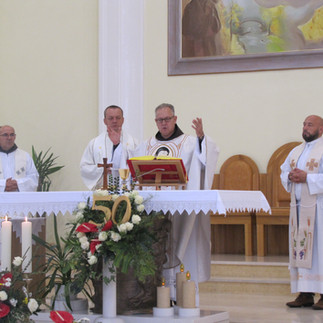 Taj sat molitve pripremio je srca za slavlje euharistije koju je predslavio provincijal Franjevačke provincije Bosne Srebrene fra Zdravko Dadić, a koncelebrirali su: definitor i ekonom Bosne Srebrene fra Vinko Sičaja, župnik na Stupu i sarajevski dekan preč. Miroslav Ćavar te župnik u Briješću i urednik Katoličkog tjednika vlč. Josip Vajdner, koji kroz tjedan slavi svete mise u crkvi sv. Vinka. Zajedno s nama molile su sestre karmelićanke kao i vjernici koji svakodnevno dolaze slaviti svetu misu u samostanskoj crkvi Bezgrešne Kraljice Karmela. Među trideset sestara koje su došle na ovaj susret bila je i naša misionarka na Salomonskim otocima, s. M. Ruža Raič, na čemu smo Bogu posebno zahvalne. Propovjednik nas je pozvao da zahvalnim srcem pogledamo odakle smo krenule, kojim putem smo išle i kamo ćemo koracati. Podsjetio nas je da danas slavimo pedeset godina provincije, no tragovi dobrote otisnuti po našim sestrama prepoznaju se u Bosni i Hercegovini već sto pedeset i tri godine. Pozvao nas je da se ponovno zagledamo u lik Majke Divne i lik sv. Vinka kako ne bi ubrzana koraka prolazile pored potrebnih. Pred nam je svjetla budućnost, već sad obasjana svjetlom Uskrsa. No, potrebno je prepoznati sve kamenolome koji su se nadvili nad naše poslanje i živote u želji da nas potope, te postom, adoracijom i žrtvom otklanjati kamenje koje nas želi ostaviti u grobu. Ove nakane, kao i brojne zahvale, utkale smo u molitve vjernika, koje je napisala i čitala s. M. Katarina Dunđer .